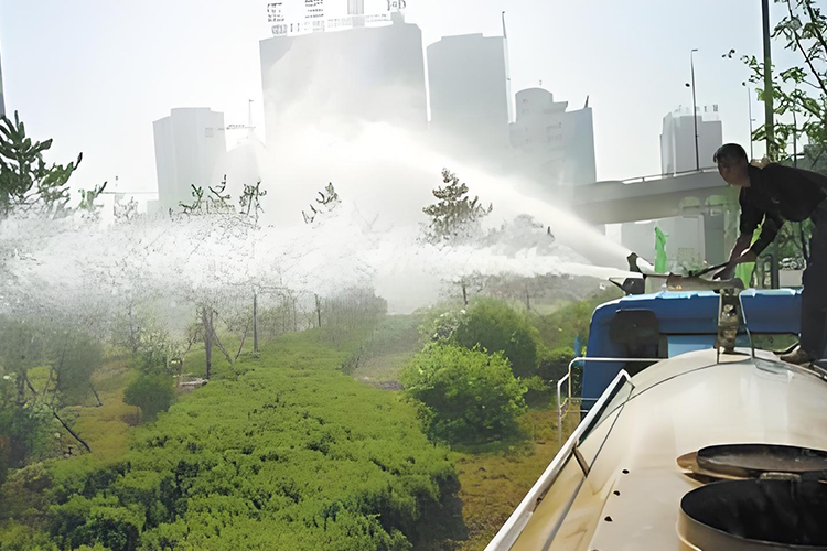 洒水冲洗路面主要是用前喷功能,通过洒水车自带的泵将水高速的冲向路面,使路面上的泥土冲洗到路边上,确保路面的整洁干净。